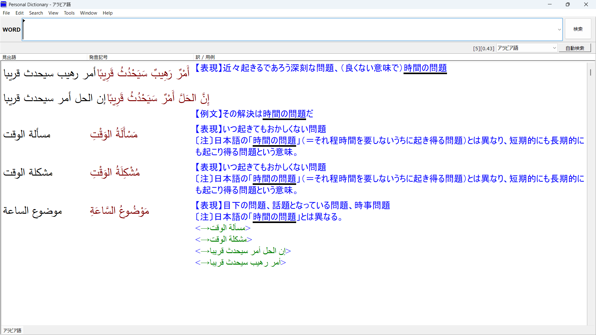 アラビア語引き続き中東情勢から目が離せず、ネットで現地の報道等を見ています。リビア情勢はそろそろ時間の問題になってきた感があります。現地報道を読んでいて、時折初めて目にする単語・表現等があり、その都度辞書に追加登録しています。