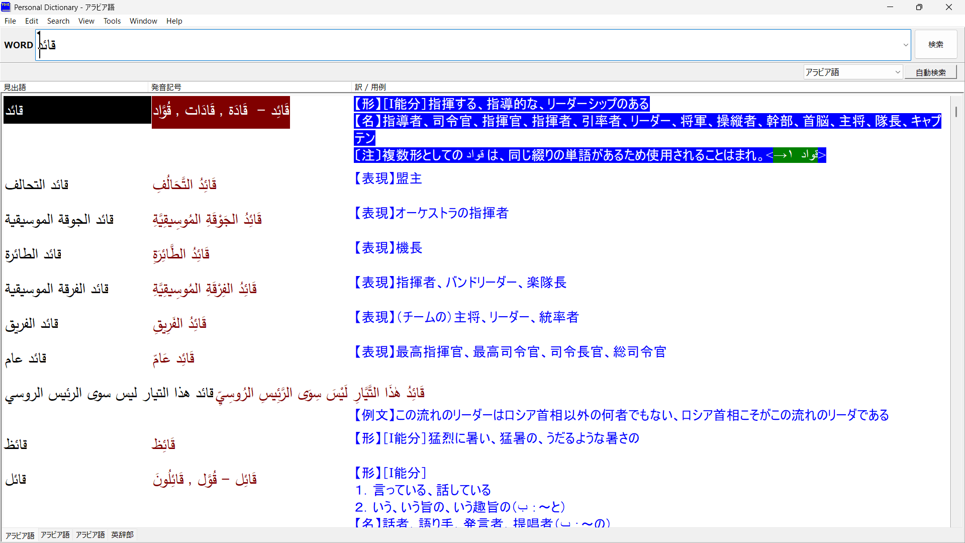 この説明を踏まえ、次期中級辞書バージョンで「قائد」について、訂正しておきたいと思います。