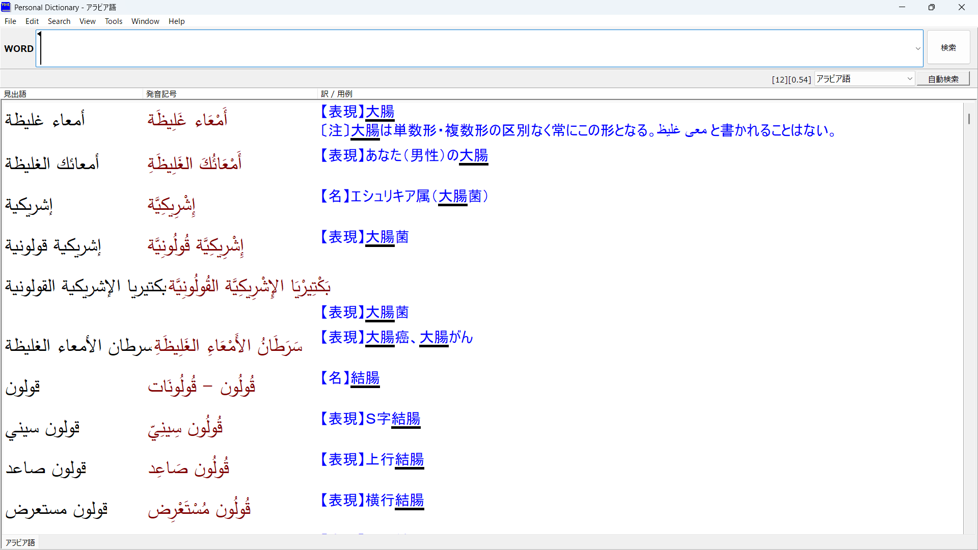 これまで、本辞書では、昔のアラビア語-英語辞書で記載されていた「معى غليظ」を大腸の訳語として入れていましたが、現代ではこの表現は使われないようです。