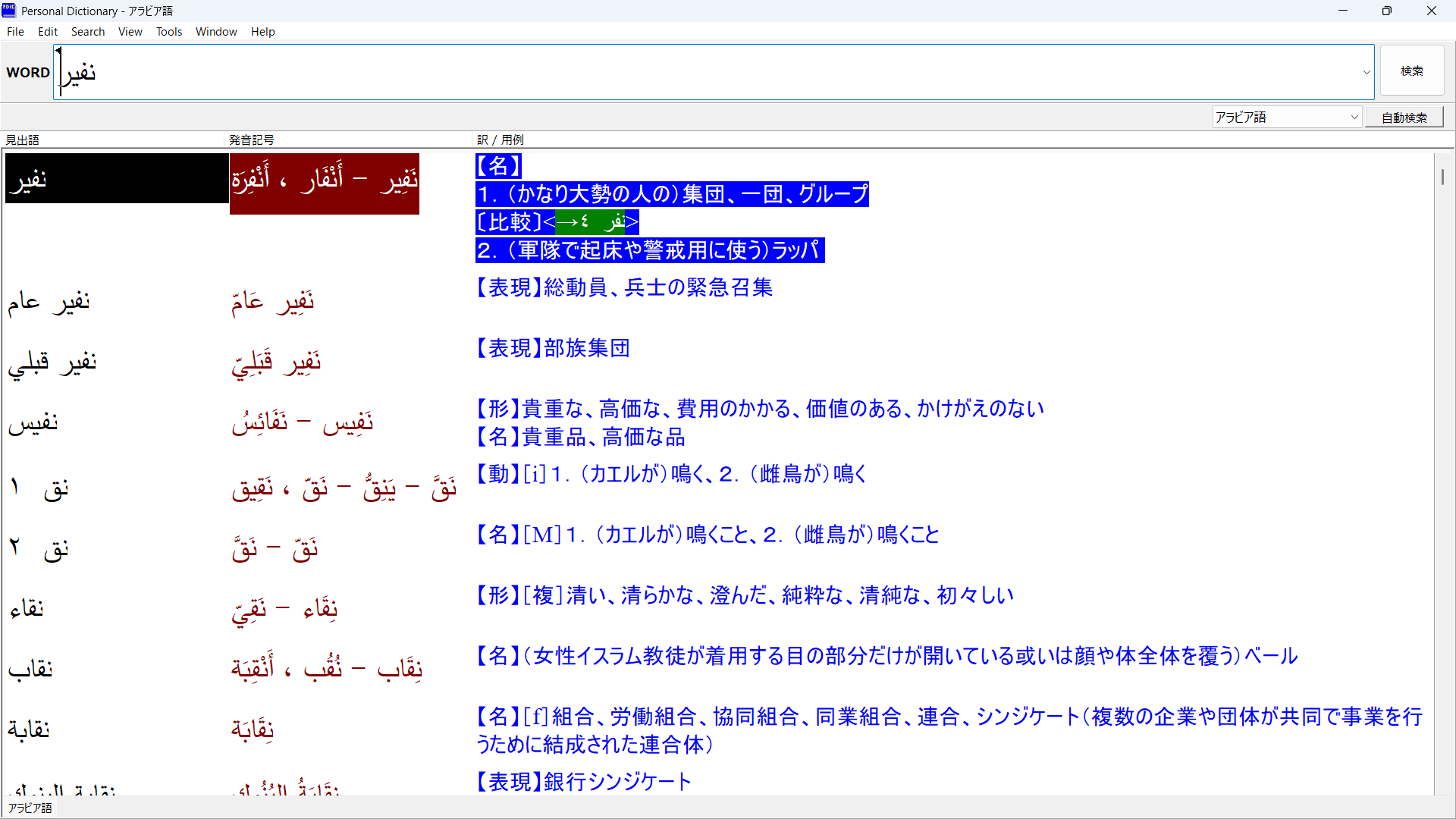 語根が同じ語に「نفر」がありますが、「نفر」は少数の人から成る集団であるのに対し、「نفير」は大勢の人で構成される集団になります。